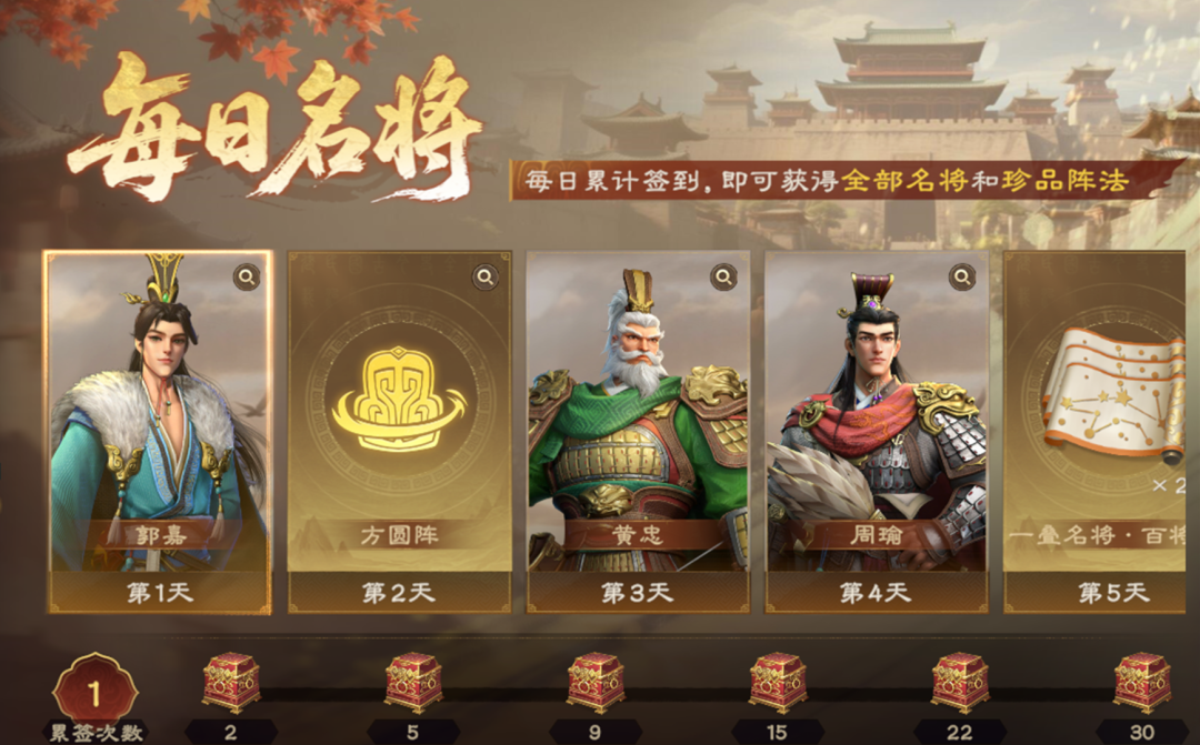 每日登录签到,即可领取寻访英豪卡池中全部S1名将以及各类道具奖励。本活动所有区服均可参与 。