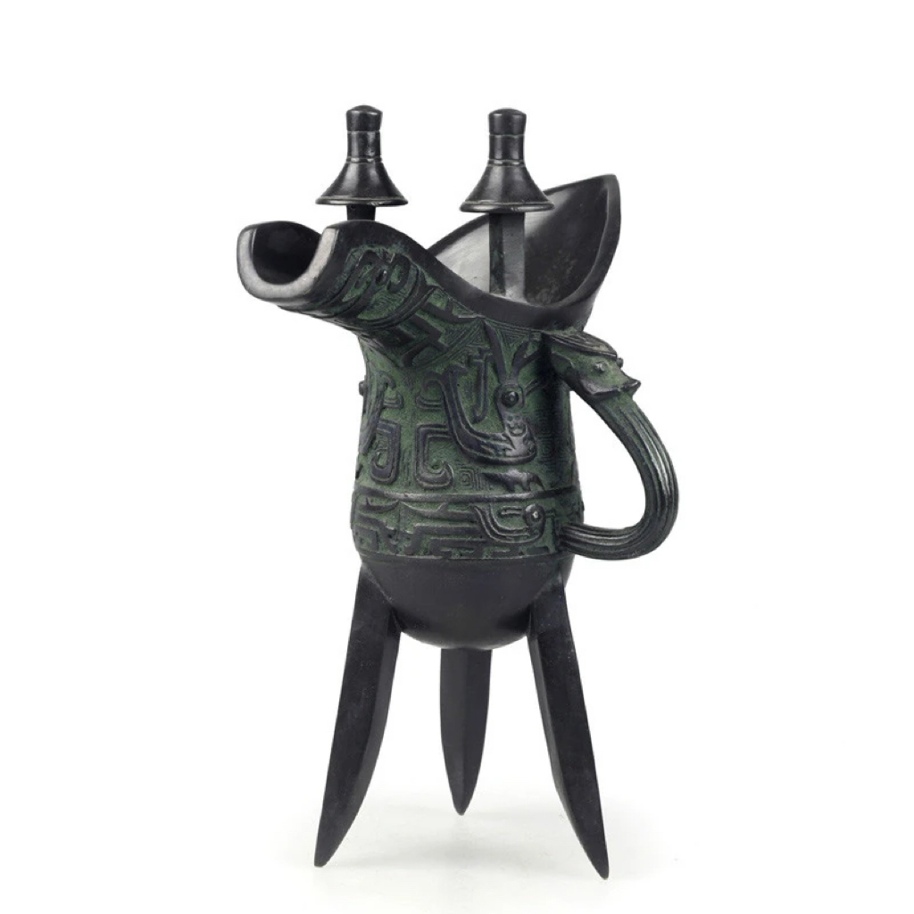 细观这尊爵杯,三足鼎立,稳如山川;流尾上扬,势若飞羽。杯身饰以云雷纹、饕餮纹,庄重神秘,触之仿佛可闻钟磬雅乐。