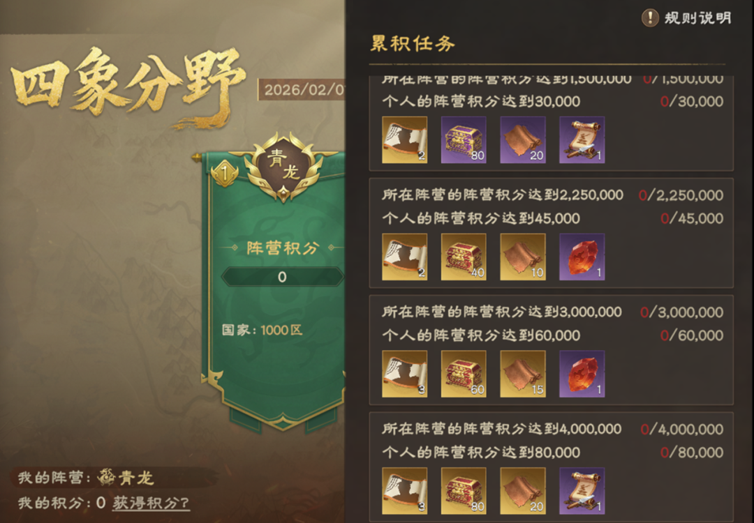 XP1赛季全新活动“四象分野”来袭:代表阵营参与周常活动获得积分,达到指定条件获得稀有奖励,活动结束根据阵营积分排名获得排名奖励。