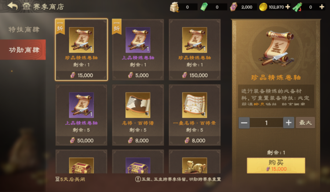一折珍品和上品精炼卷轴以及其他珍稀道具,可使用功勋进行兑换;
