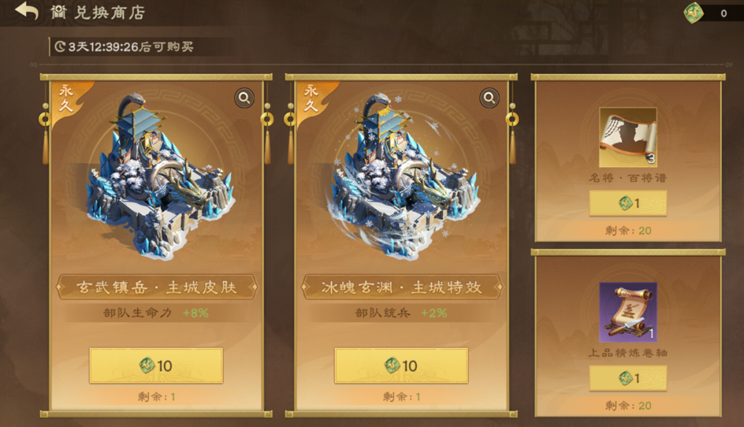 ●也可消耗九州币直接兑换“玄武镇岳”主城皮肤以及“冰魄玄渊”主城特效;