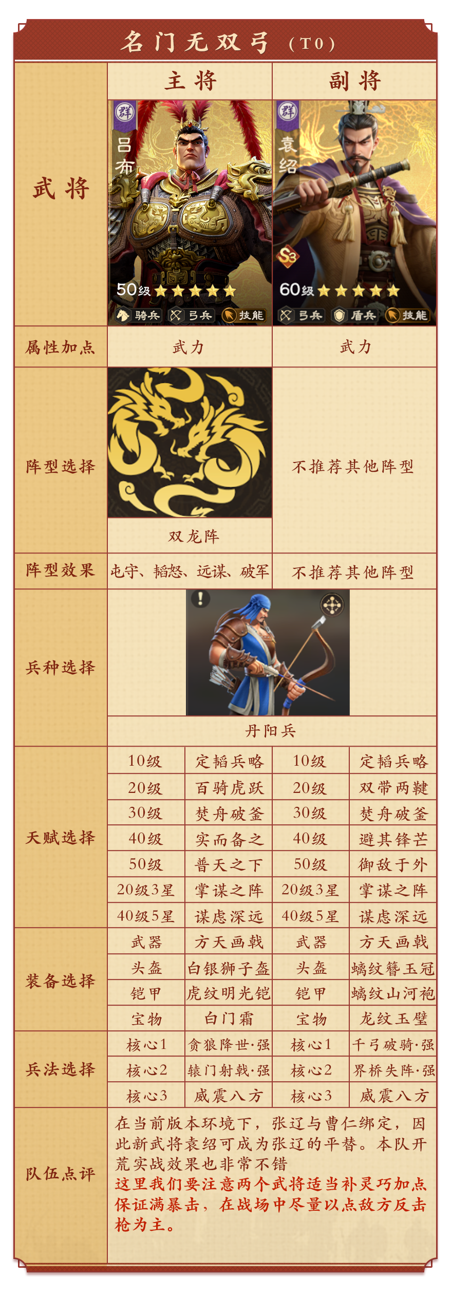 ●比较强力的技能体系开荒队伍,其中吕布可替换为曹仁,攻打时需选择克制的枪兵;