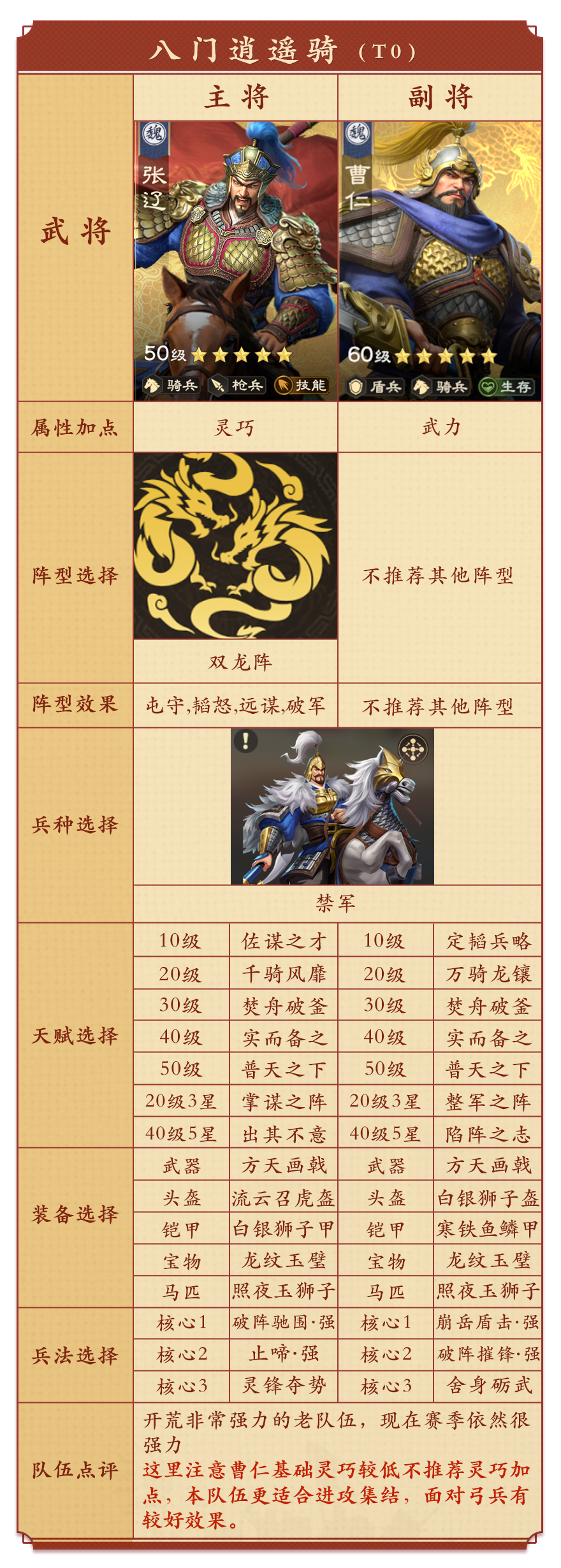 ●比较强力的技能体系开荒队伍,其中曹仁可换为为赵云或吕布。攻打时需选择克制的盾兵;