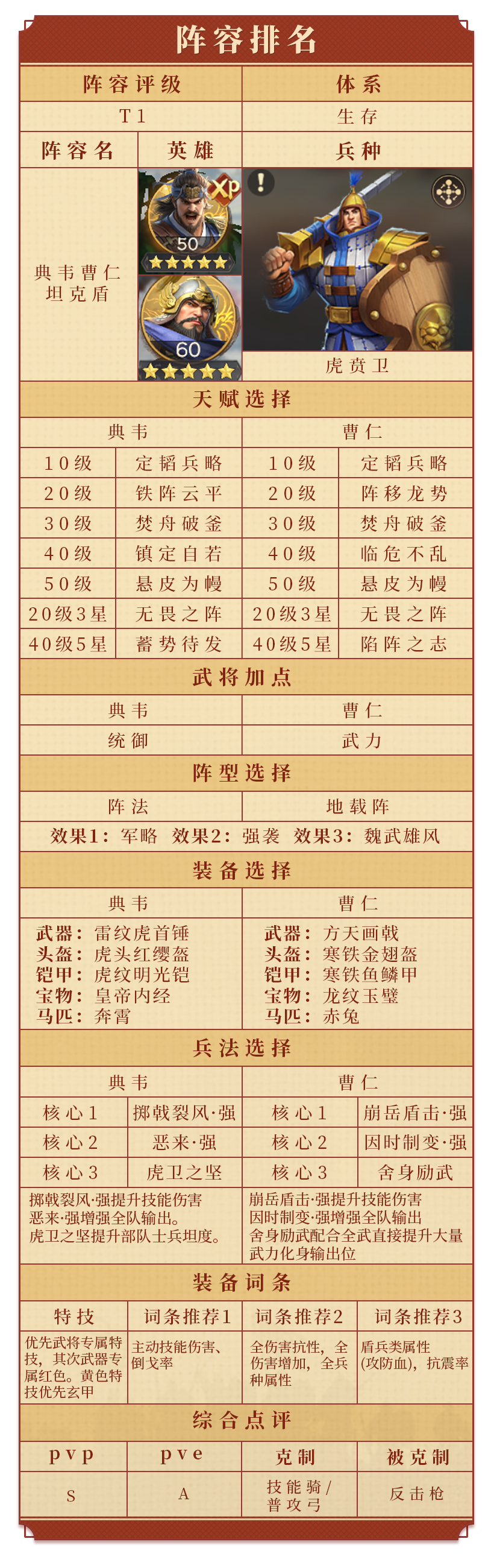 ●适配体系:既能搭配控制体系,与曹操组成控制盾,限制技能队、普攻队及诸葛异常队;也能契合生存体系,与曹仁组建生存盾,凭借回怒机制和生存属性稳扎稳打