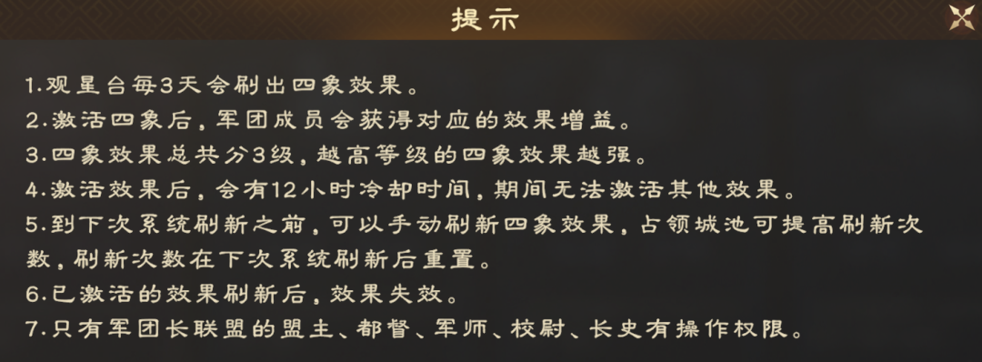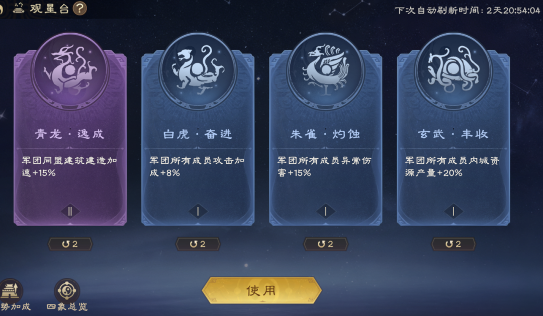 观星台会每天刷新各种加成,可选择其中一个激活获得加成。