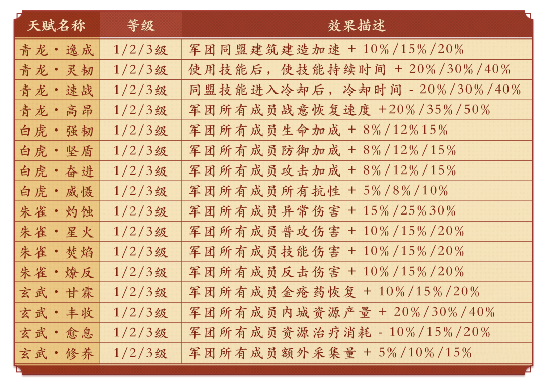 ●白虎/朱雀:正面作战时开启,加强自身的部队战斗力;