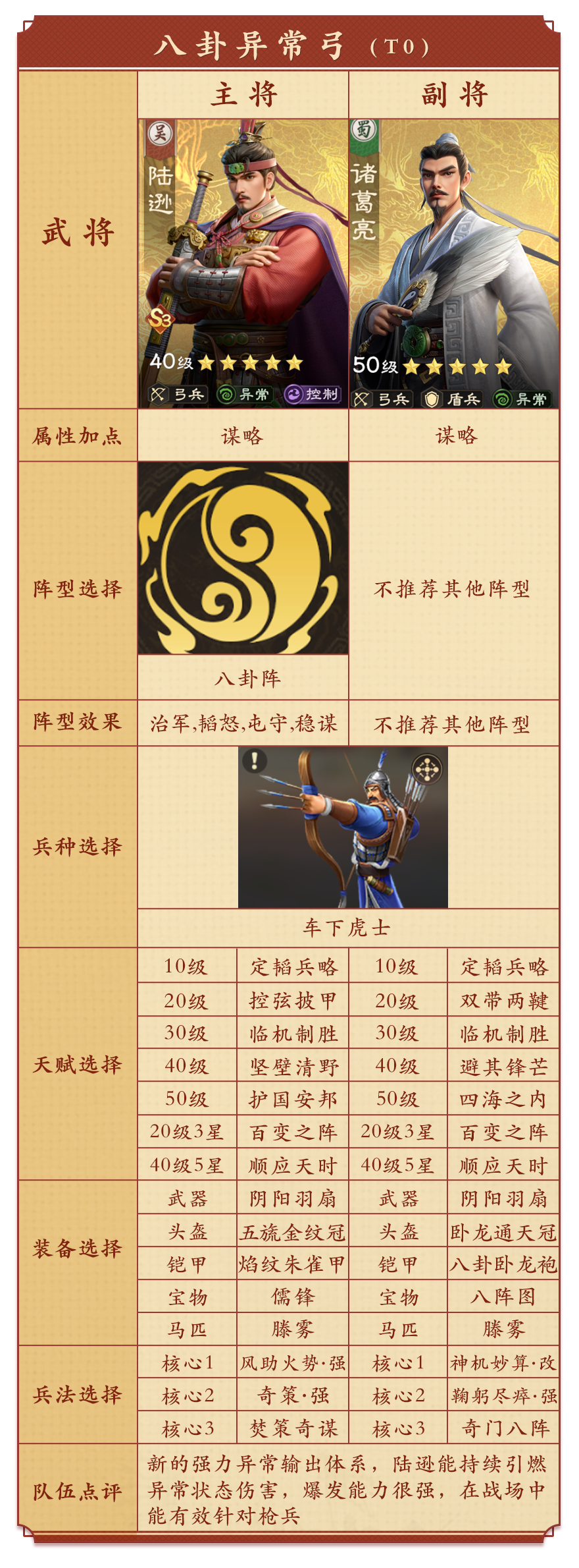 这一兵种非常适合之前的异常弓体系,尤其是陆逊+诸葛亮的体系。此前这套阵容强度中规中矩,在该兵种加持后强度将有所提升。