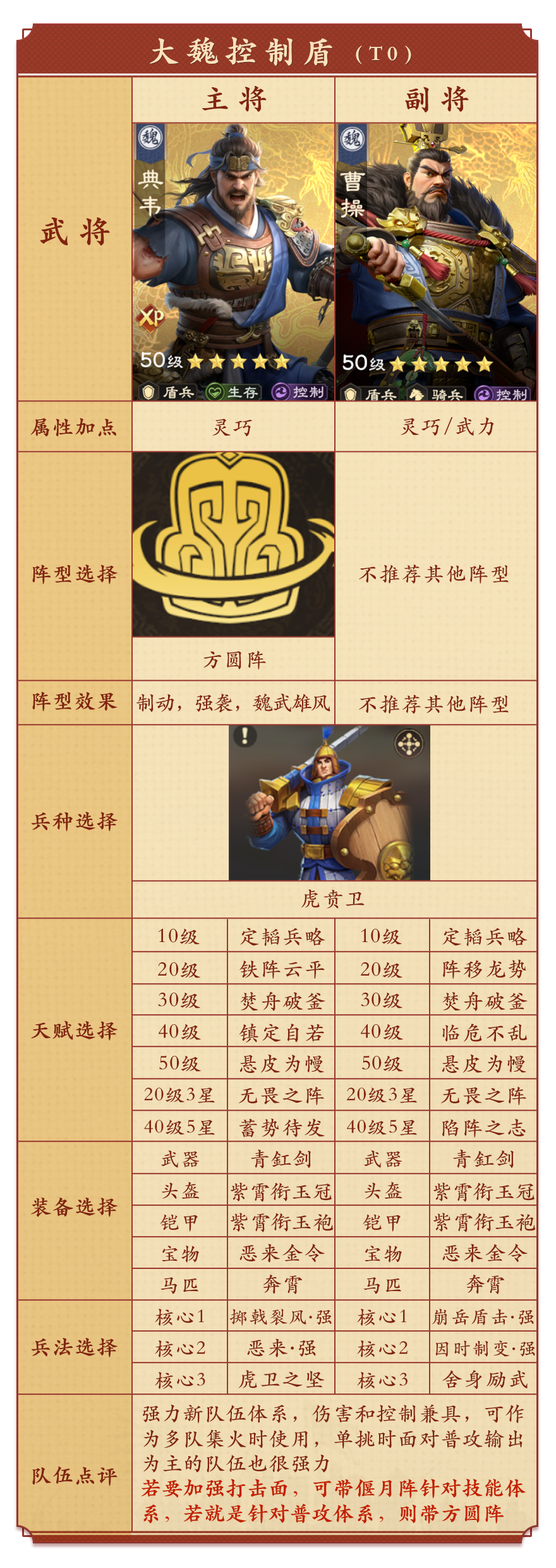 全新的强力控制体系,在控制状态下,典韦和曹操的输出和生存都非常不错,能有效克制对面的多种队伍,尤其适合野战混战。