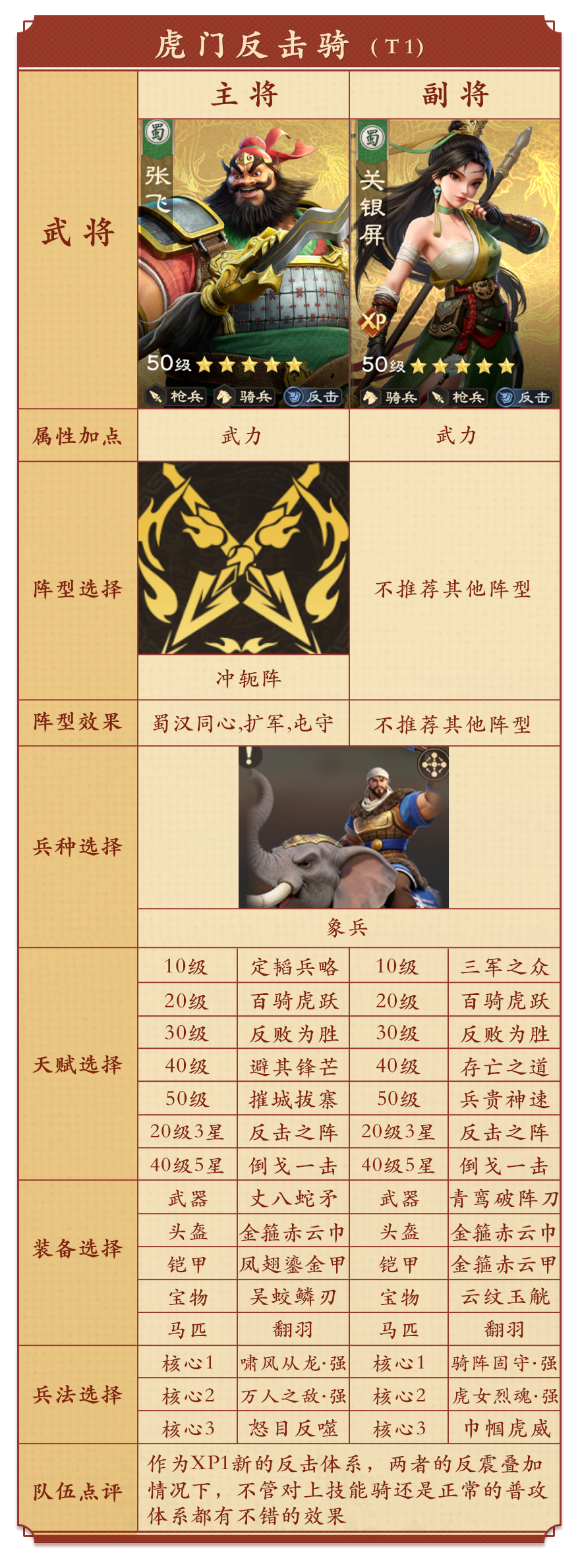 全新的反击体系阵容,拥有超高反震率,对技能体系队伍具备极强抗性,堪称XP1新贵。非常适合野战混战,也可作为集结车头使用,搭配象兵还能进一步提升反击伤害,战力再升级。