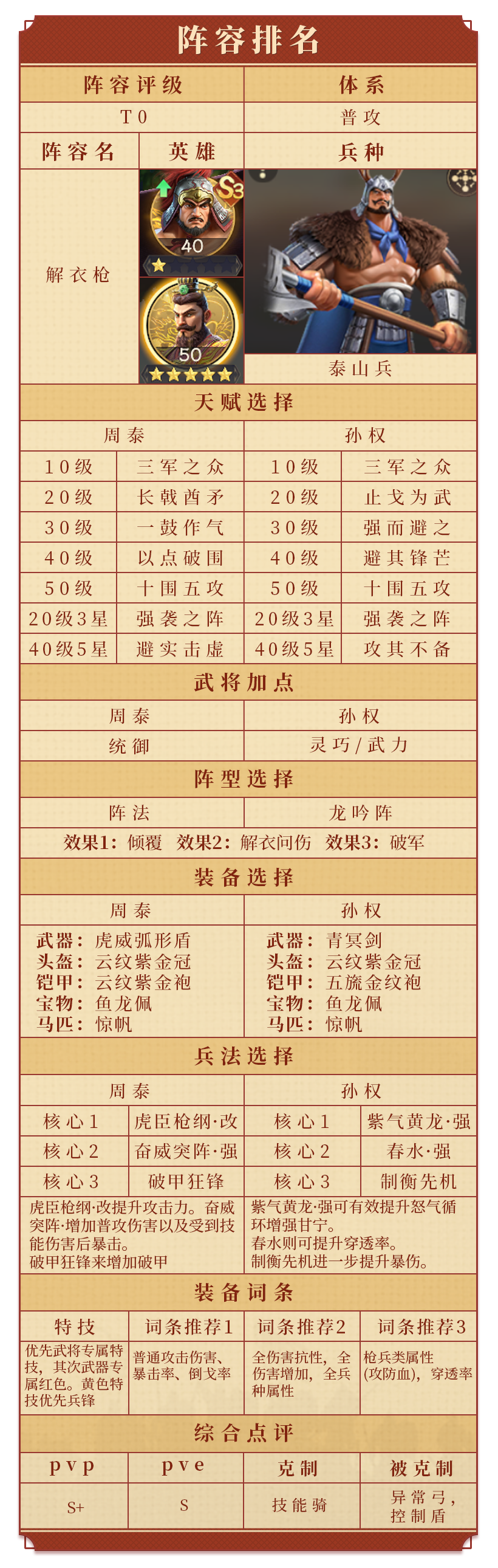 ●搭配周泰可以吃阵型本身高额的附伤,完美解决了孙权周泰存在爆发不足的问题,与此同时可以布阵效果可以点出增伤和倒戈,都是队伍刚需。