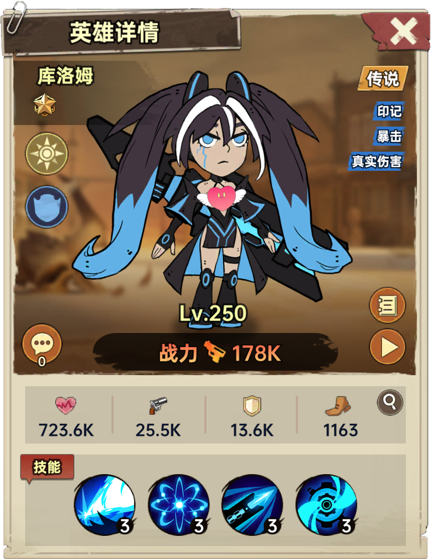 时空印记:受到主动攻击时,提升自身18%暴击和7%真实伤害,持续3回合。并对目标附加一个可造成70%攻击伤害的【暴击印记】,持续到战斗结束。