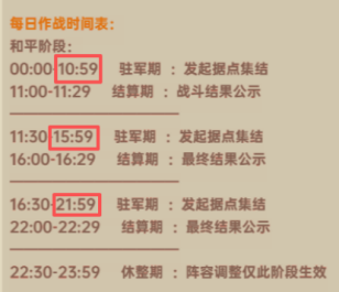 战斗时间:每日3场,最晚驻军为早上11点之前、下午4点之前、晚上10点之前,指挥官务必记住!