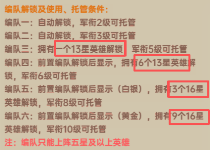 最基础的大家拥有2队编队,随着拥有的高星级英雄越多,扩展的队伍也就越多。大多情况下,优先培养6名13星英雄解锁4队→3名16星英雄解锁5队→9名16星英雄解锁6队。