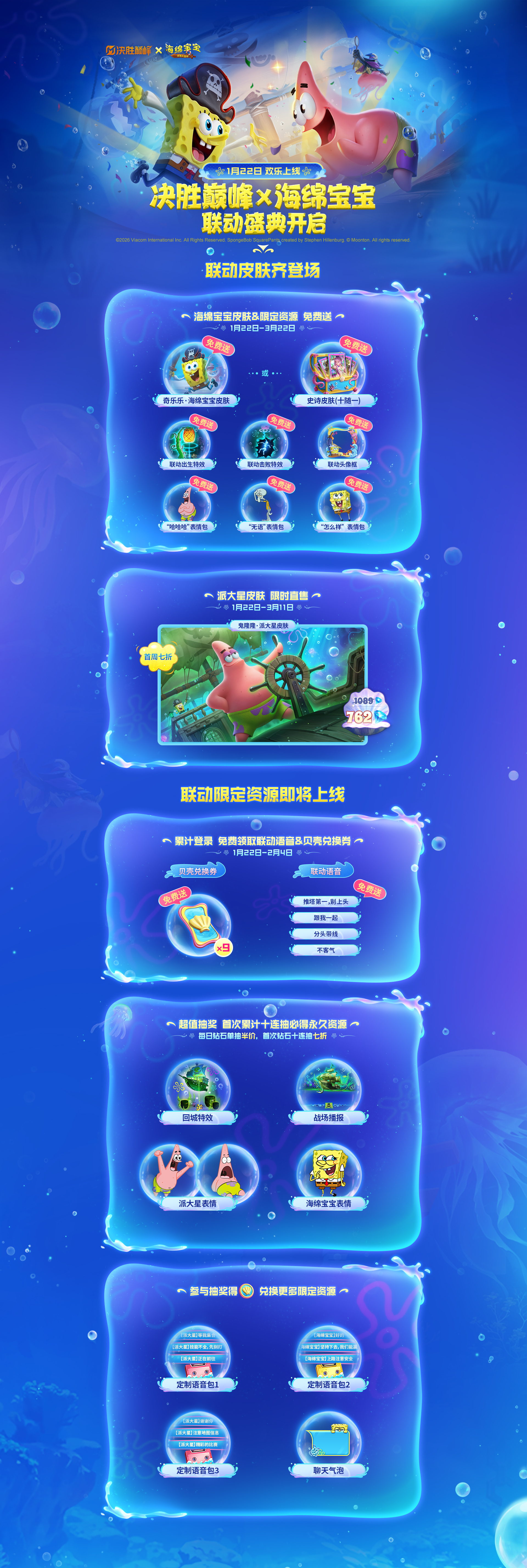 海绵宝宝与派大星联动皮肤即将上线,参与海底餐厅活动免费得海绵宝宝联动皮肤,更有联动回城、表情、出生特效等