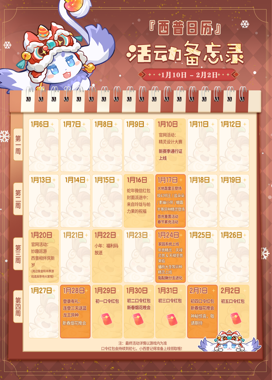 详细活动安排点击下方长图查看活动日历即可了解,小西普们可以在评论区和普普说说大家对1月份的活动都有哪些期待,普普继续去打探消息……