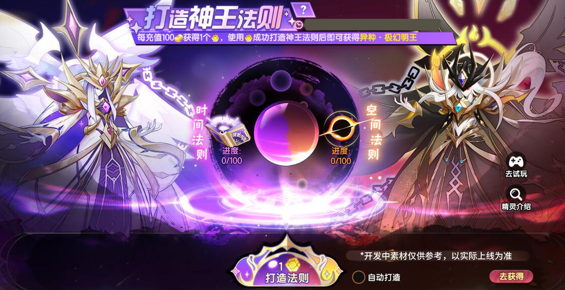 4、每次打造消耗1个打造道具,将随机打造时间法则或空间法则[10-20]点进度,两个法则进度均达到100点时可获得异种精灵·极幻明王。