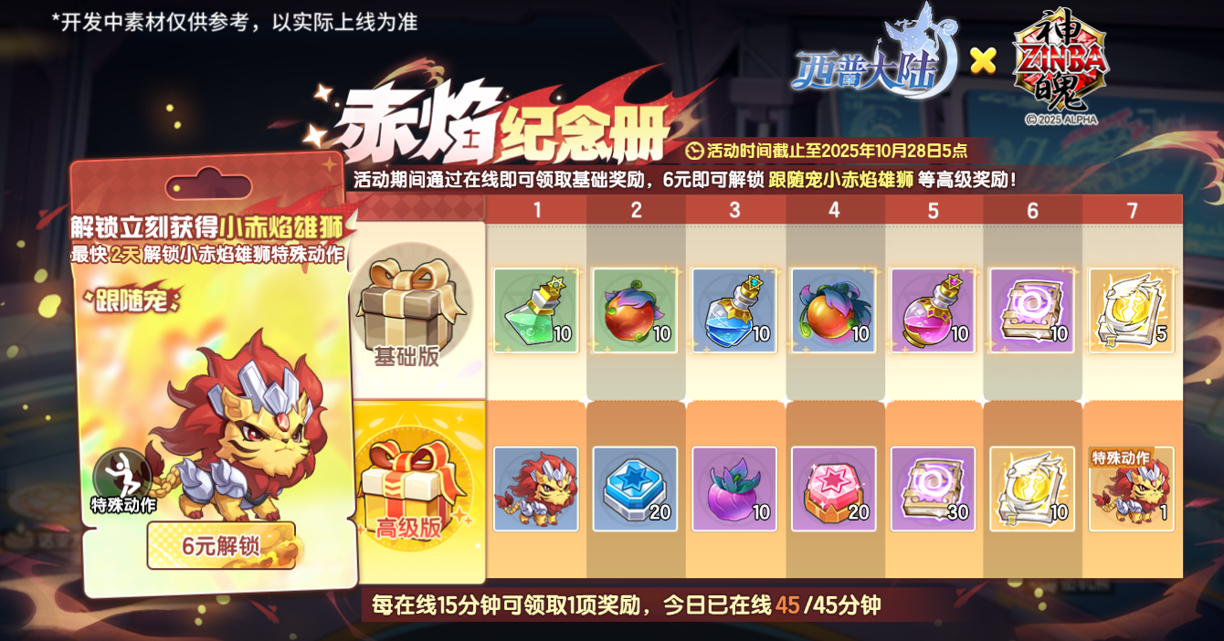 活动期间通过累积在线时长,即可免费领取星魂秘药、经验果等基础奖励,解锁高级版打卡册即可获得联动跟随宠·小赤焰雄狮!