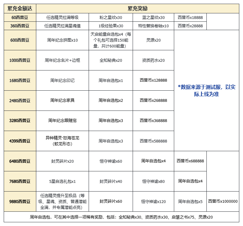 为感谢小西普们长久的支持与陪伴,西普大陆为大家准备了充值奖励大回馈。本次累充从2025年9月26日5:00开始计入,活动期间累计充值达到指定的金额即可领取对应的超值奖励。(购买年度精灵、通行证、基金等直购均计入累充额度)