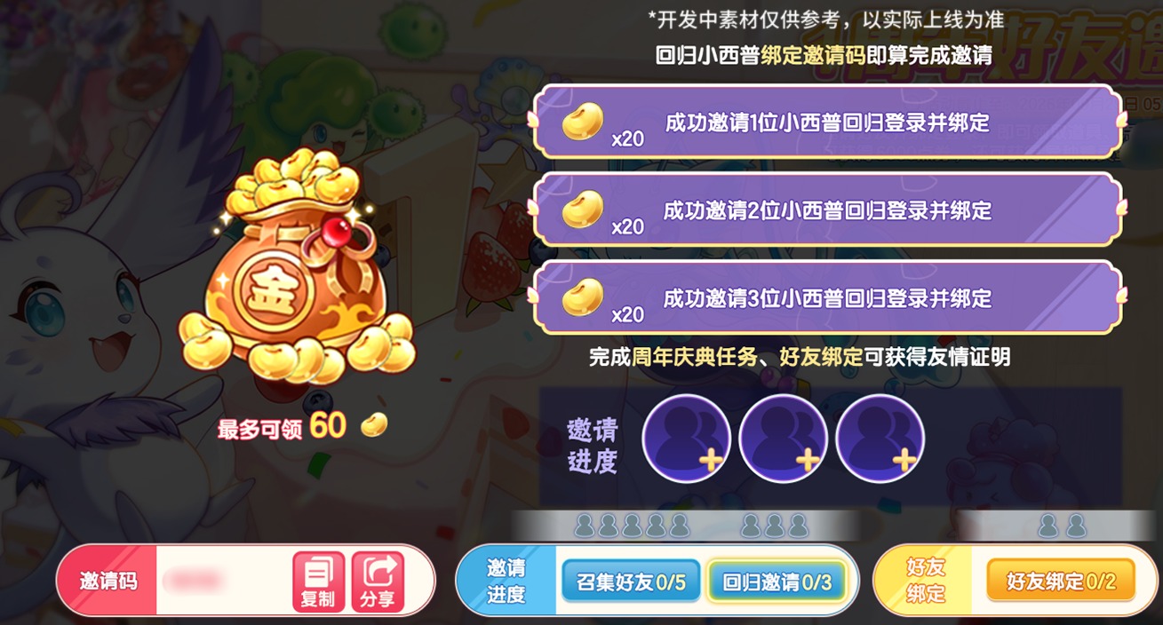 邀请好友并完成登录绑定,即可领取道具、点券等奖励,若绑定好友为回归小西普还可获得西普豆哦!