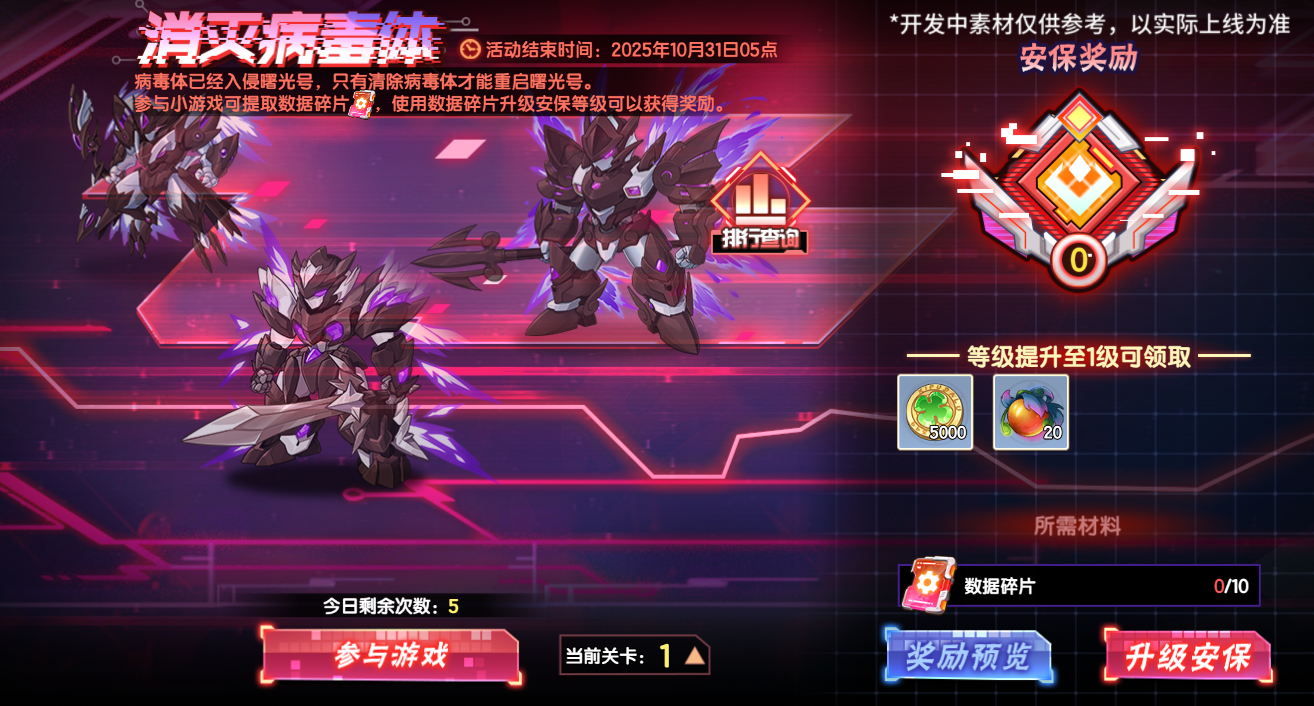 病毒体已入侵曙光号,请清除病毒体重启曙光号,参与游戏可提取数据碎片,使用数据碎片升级安保即可获得安保奖励。挑战排行榜在10月31日结算,可获得纪念拼图——数码拼图。