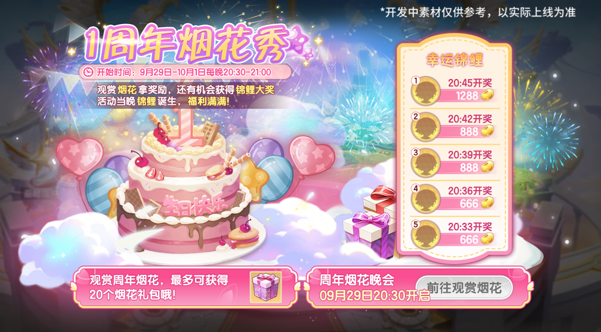 观赏周年烟花秀领取奖励,还可参与幸运锦鲤抽取获得大奖,最高可获得1288西普豆!