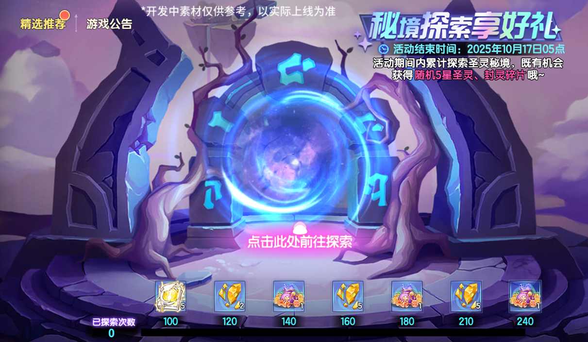 活动期间累计探索圣灵秘境的次数可获得:随机五星圣灵、封灵碎片、全知秘典等珍稀道具