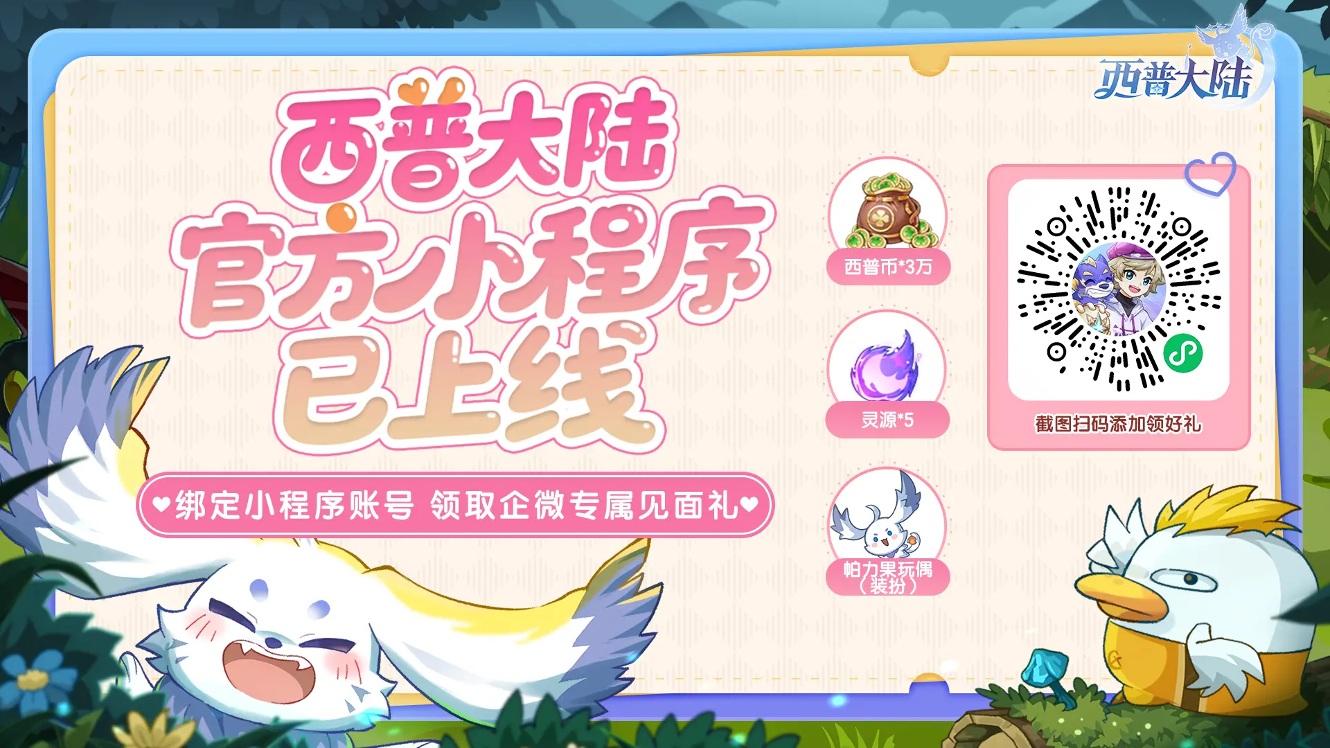➤西普大陆小程序上线,绑定即可领取奖励:西普币*30000、灵源*5、帕力果玩偶(装扮)*1