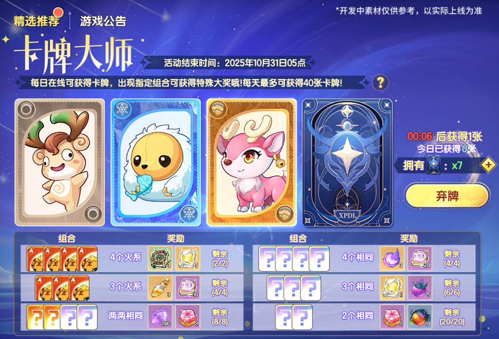 每日在线可获取一定数量的卡牌,不同卡牌组合排列后,将有机会获得不同奖励。翻出指定组合,还可获取特殊大奖,快来试试你的运气吧!