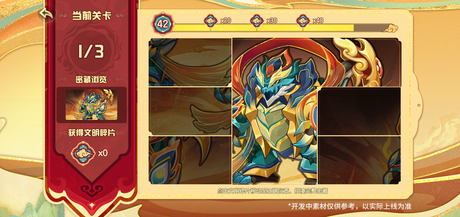 每日通过玩法累积达到600文明碎片后,将获得每日礼包,其中包含九色神枝(随机获得1~3个)、五铢钱和启慧之书。累积获得一定的通关进度,还可以领取九色神枝以及凤翎([敦煌飞天]活动中的装扮抽取道具)奖励。