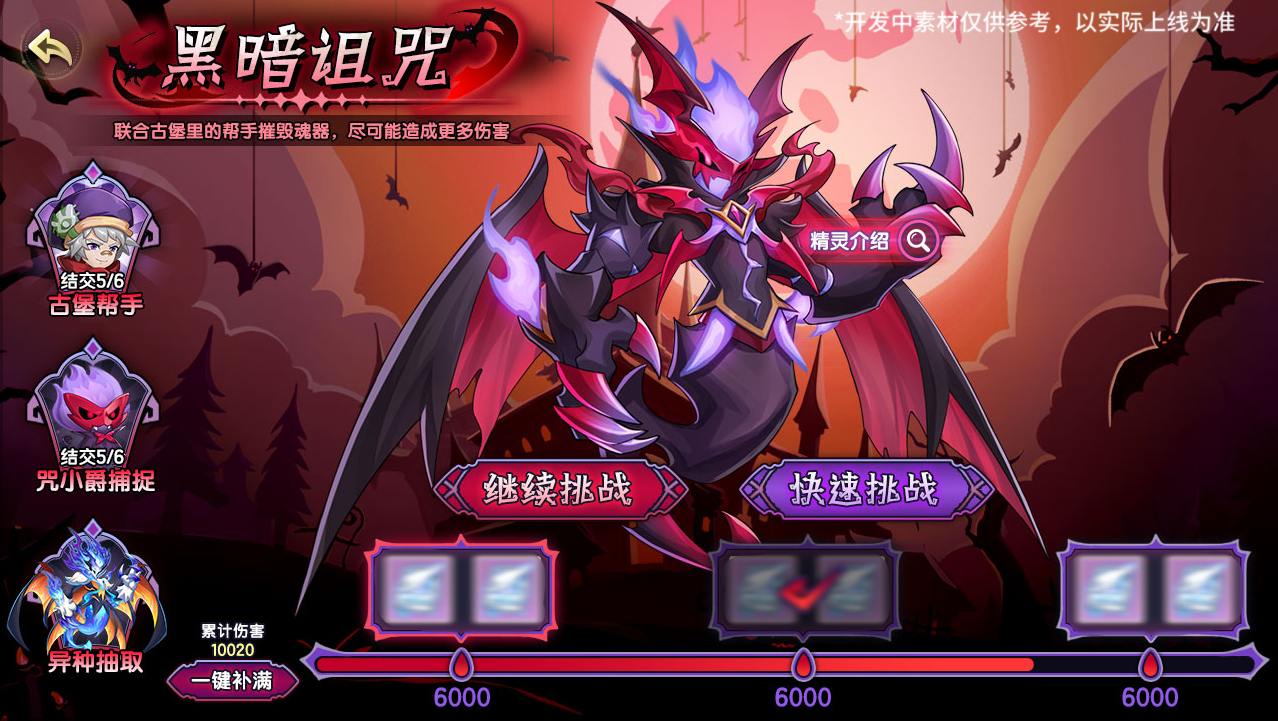 在野外可捕捉到伪装成小蝙蝠的精灵咒小爵(一阶)。活动期间内,根据对咒影鬼爵累计造成的伤害值达到不同要求可获得相应的奖励,累计达到对应的伤害值可获得进化晶核。