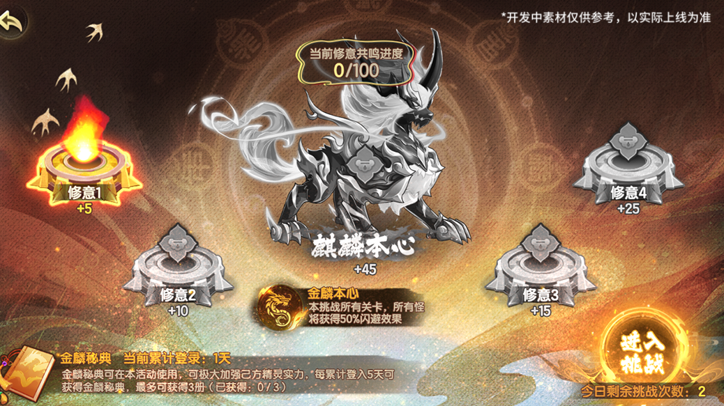活动说明:协助圣·耀麟完成修意、修心、修禅三项修行。将心意禅三项修行的共鸣进度总和修行至210即可领取敦煌系列主题第二异种-圣·耀麟。