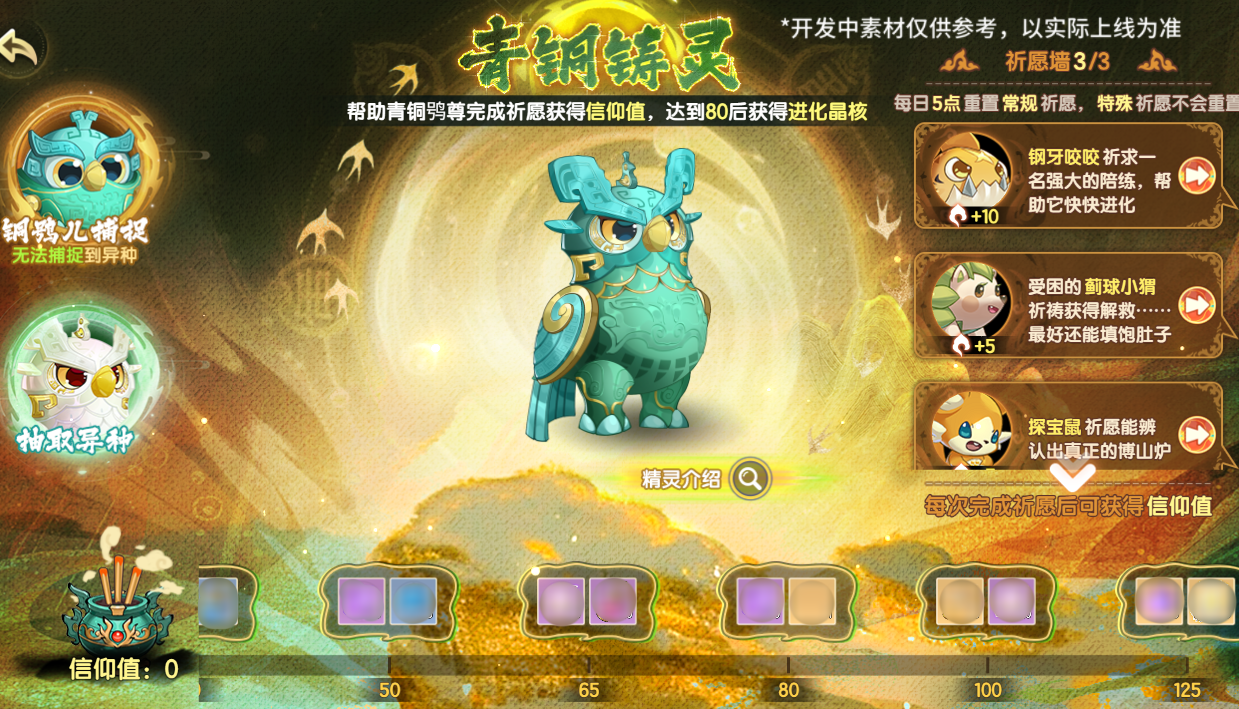 小西普们可前往星月悬洞捕捉铜鸮儿(一阶精灵),每日完成祈愿墙上发布的常规祈愿任务可获得信仰值,根据信仰值领取相应的奖励,达成一定的信仰值可领取铜鸮儿的进化晶核。此外,当信仰值达到一定阶段会出现特殊祈愿,完成特殊祈愿将增加信仰值并了解到精灵们的小故事。