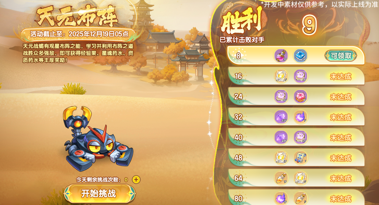 天元战蝎拥有观星布阵之能,选择合适的小伙伴跟天元战蝎学习布阵之道并挑战众多强敌,累计击败对手达到一定数量即可领取奖励!