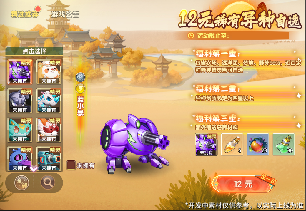 稀有异种自选,小西普们可选择购买自己喜爱的异种精灵,精灵保底4星资质,还有超值成长礼包相送。