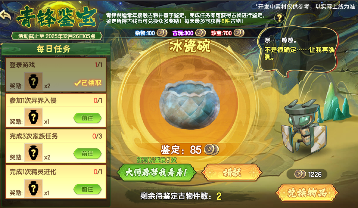 青锋剑螳常年接触古物并善于鉴宝,每完成1个任务即可获得1件古物进行鉴定,鉴定古物所得的活动道具可用于兑换奖励。每日最多可获得4件古物。