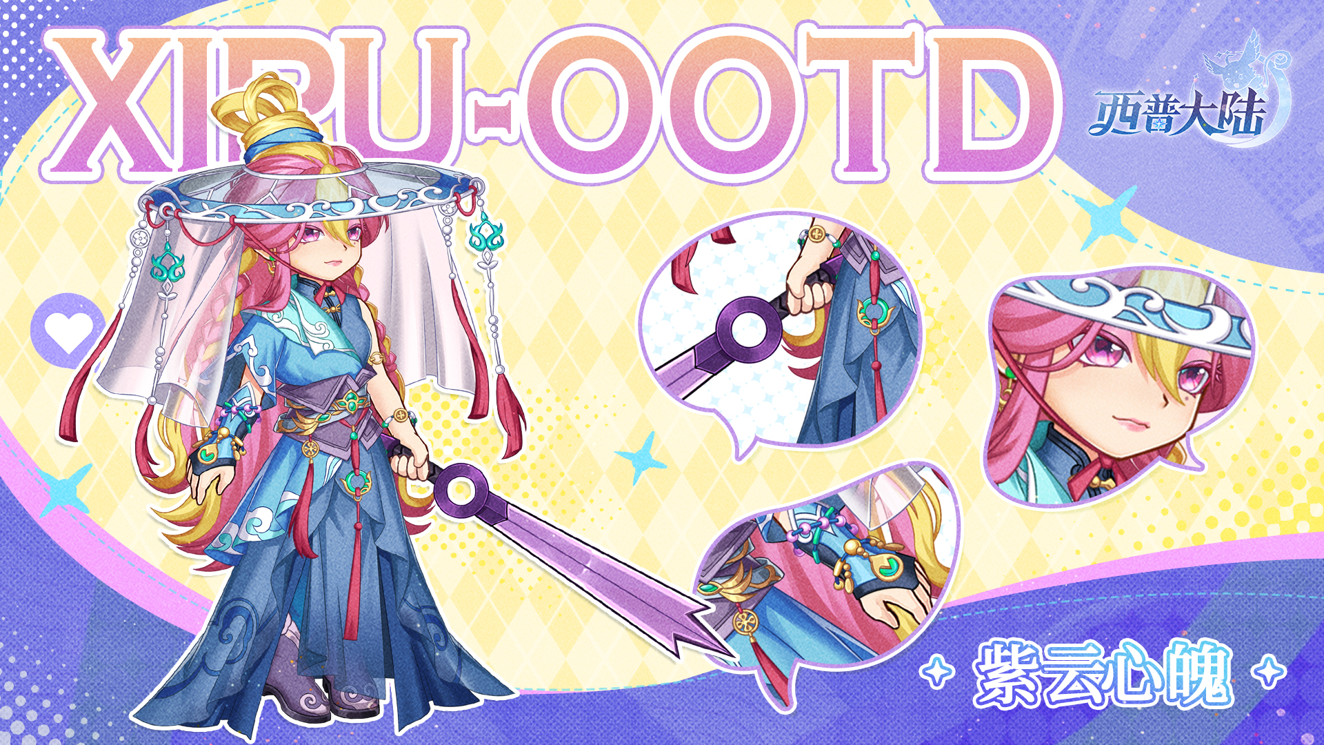 熏风飘散,翩然而至,「紫云心魄」时装同步上线。此时的她静立在晚风中,帷帽檐垂下清透的纱幕,纱幕拢起的玫色长发,宛如暮春时节最艳丽的晚霞。未被遮挡的面庞艳美娇俏,直率爽利,最妙的是眼下一点淡紫小痣,含笑时俏皮,凝神时,带那双玫紫的眼瞳也会淬成凌冽的剑意。
