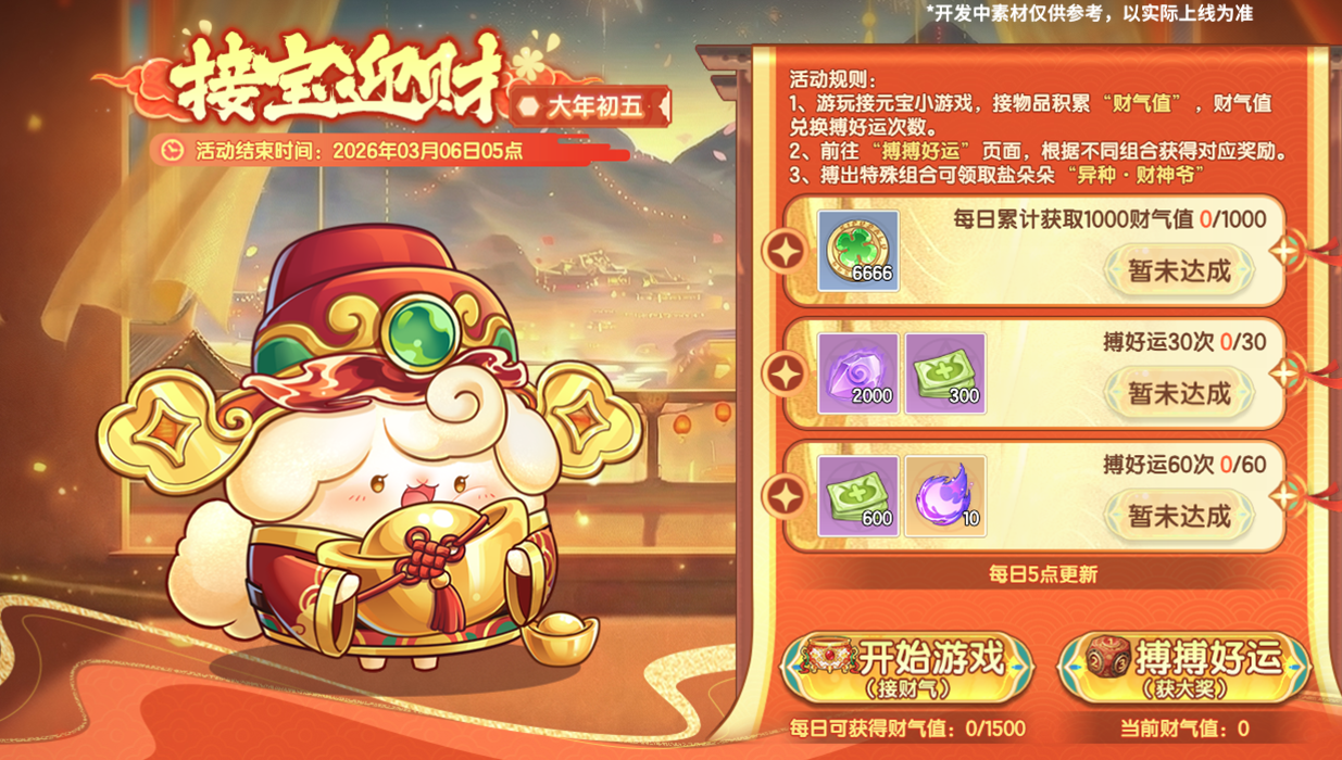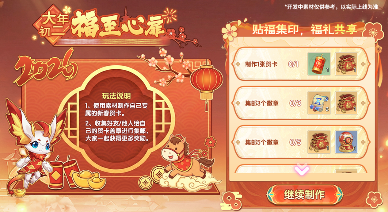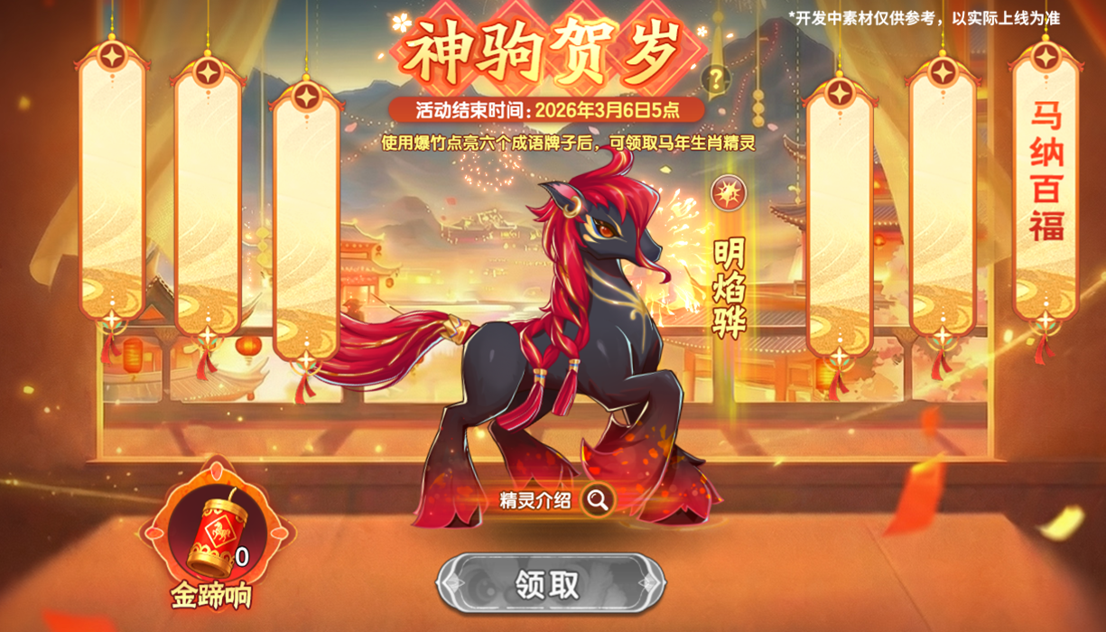 参加初一到初五的活动玩法,集齐足够多的“金蹄响”,翻开所有祝福贺词,可赢取马年限定精灵!