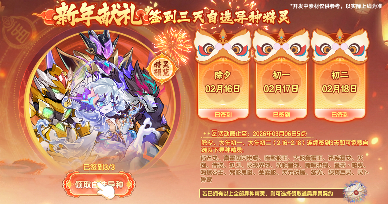 欢庆新春,喜气洋洋!在除夕,大年初一,大年初二(2月16日~2月18日)连续签到三天,即可在下列自选中选择领取任意一只喜爱的异种精灵及其进化晶核。