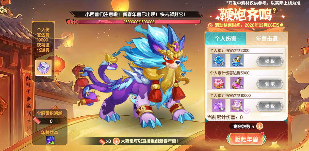 此次活动引入了特殊的“新春礼炮”,开局可从三个强力礼炮中选择一个(不仅有强力增益,就算战败了,礼炮也会对年兽造成巨额伤害)!