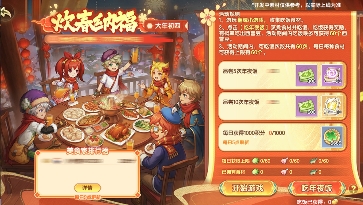 大年初四,恭迎灶神,唯有爱与美食不可辜负!活动期间内游玩翻牌小游戏,可收集鸡腿、白菜等美味食材。交付食材一起享用年夜饭,可获得道具奖励,还有机会获得西普豆奖励!