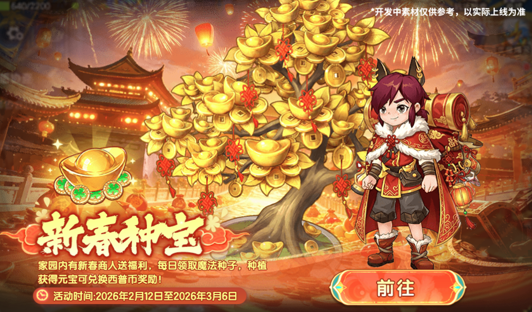 新春送福,旅行商人库塔塔带着魔法种子来啦!小西普们可前往家园找到库塔塔,每日领取相应的魔法种子,种植发财树,收获金元宝兑换奖励吧。