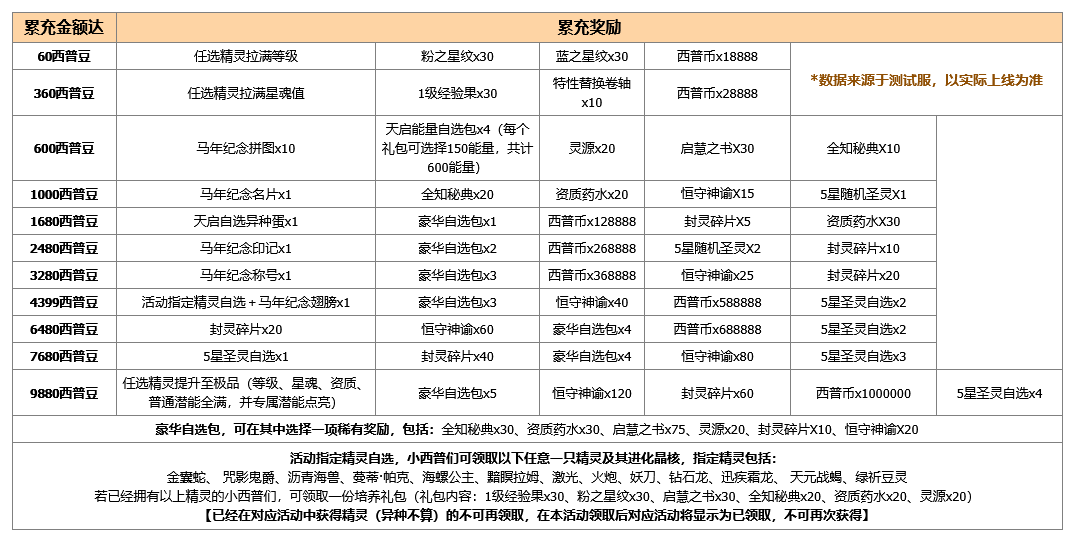 活动奖励:随机稀有精灵、随机精灵异种、灵源、全知秘典、资质药水等