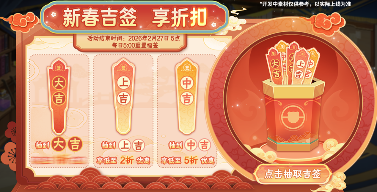 每天都可在吉签商店抽取福签,将随机获得道具2~5折的优惠折扣。小西普可以在吉签商店内以折扣价购买需要的道具奖励,不同道具会有不同的折扣优惠,春节期间部分礼包支持点券购买,机不可失!