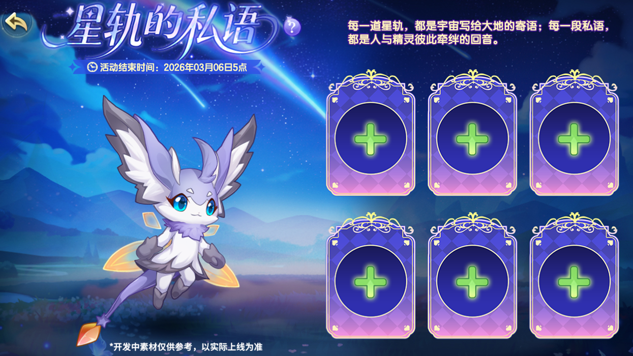 每一段私语,都是人与精灵彼此牵绊的回音。前往活动界面签到获得心愿礼物,将心愿礼物赠送给精灵即可增加信赖值并获得精灵的回礼!