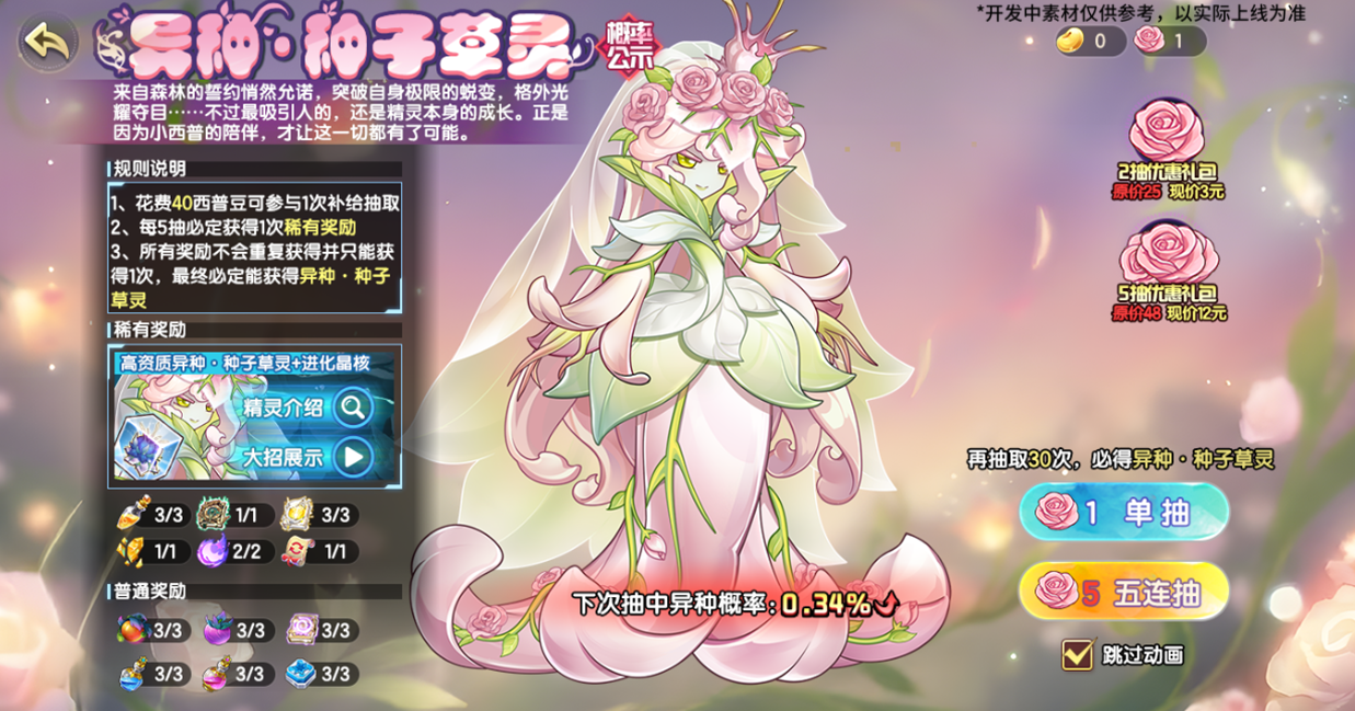 花费西普豆可参与一次补给抽取,每次抽取将有机会获得大型经验果、蓝之星纹、紫色星魂秘药等普通奖励,或异种精灵·草苞儿及其进化晶核、资质药水、同源置换卷轴等稀有奖励,抽取5次必定获得1次稀有奖励。除此之外,还为小西普们准备了超值2抽以及5抽优惠礼包!异种精灵的专属绝招特效也将同步上线。