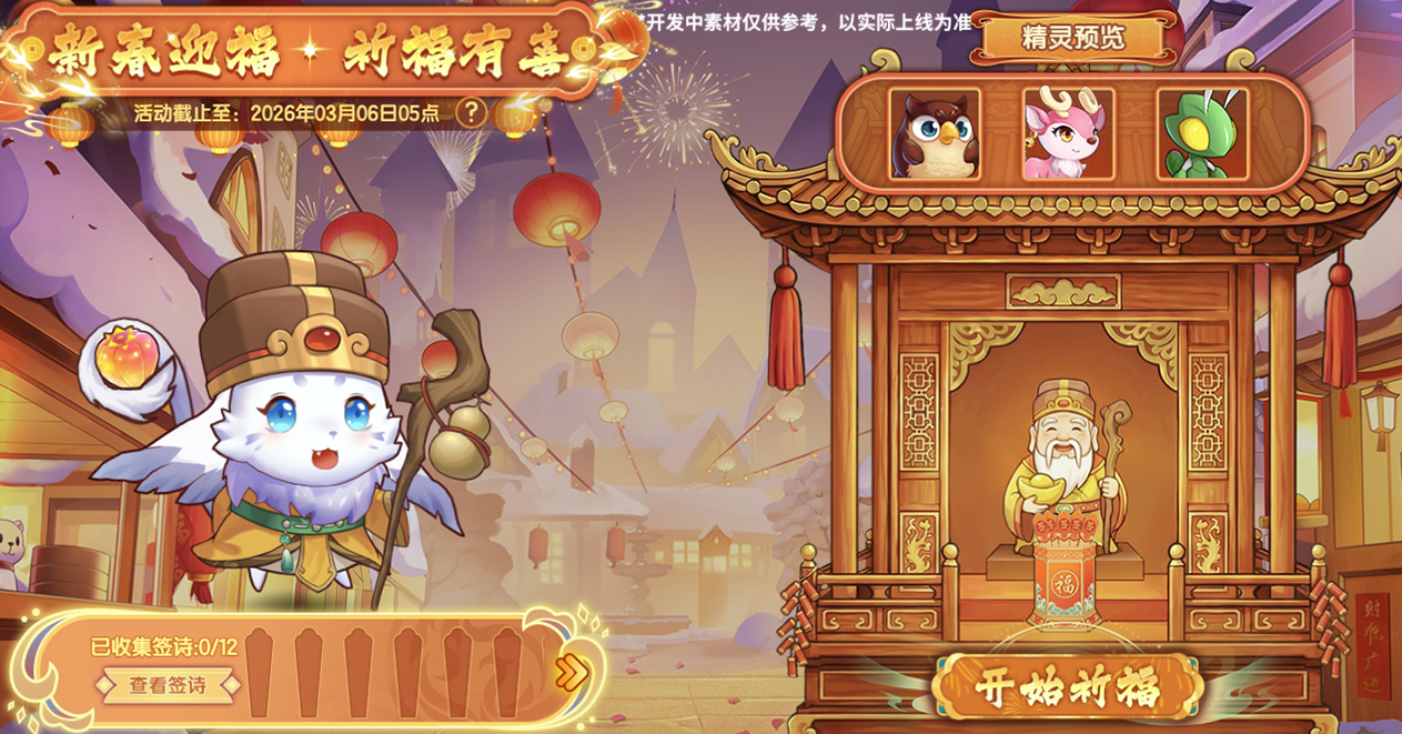 每日前往活动场景找小帕求一支灵签, 每支灵签中都藏着不同的祝福,根据签诗指引前往野外必定遇到稀有精灵或者异种精灵,快去寻找你的专属机缘吧,集齐全部12支签诗还可以获得丰厚的奖励。