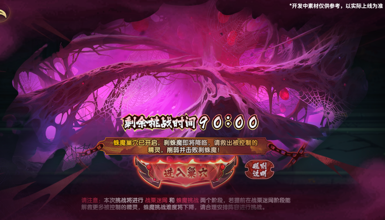 活动将分为战栗迷网与刹蛛魔挑战两个阶段,每日仅开放90分钟挑战时段,超时自动终止。