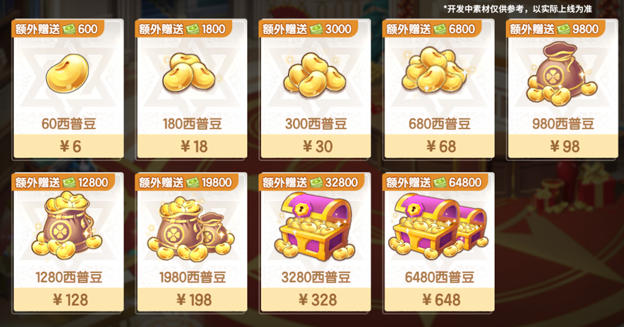 商城首充将在2月12日版本更新后重置,届时首次购买各档位的西普豆时,皆可获得额外赠送的点券。