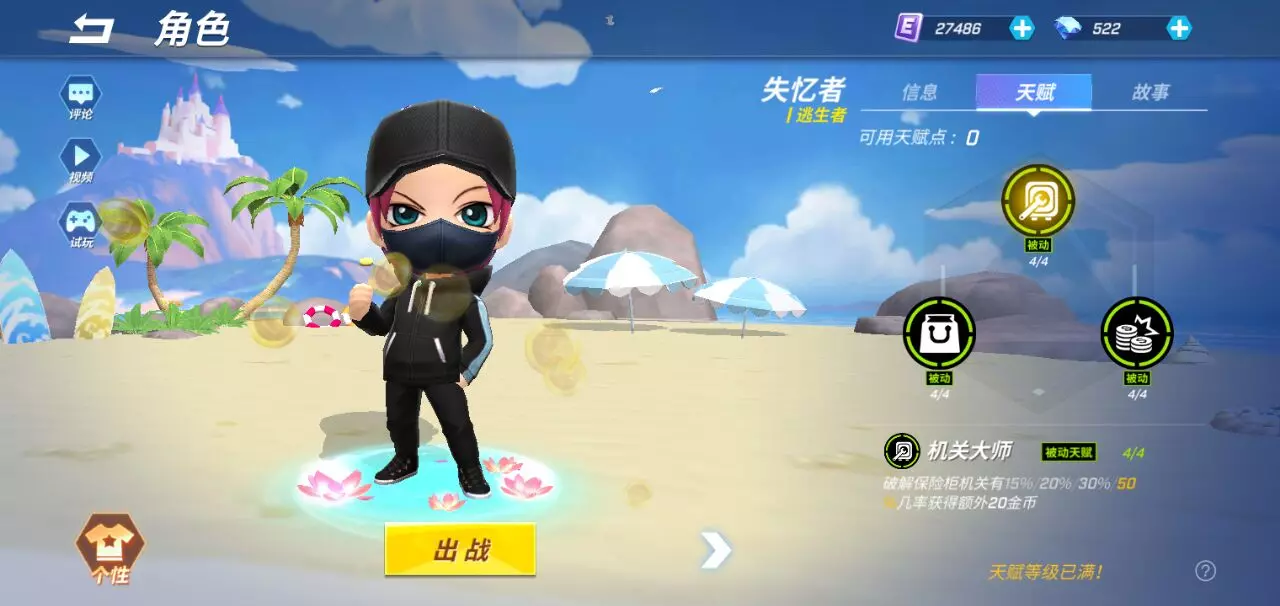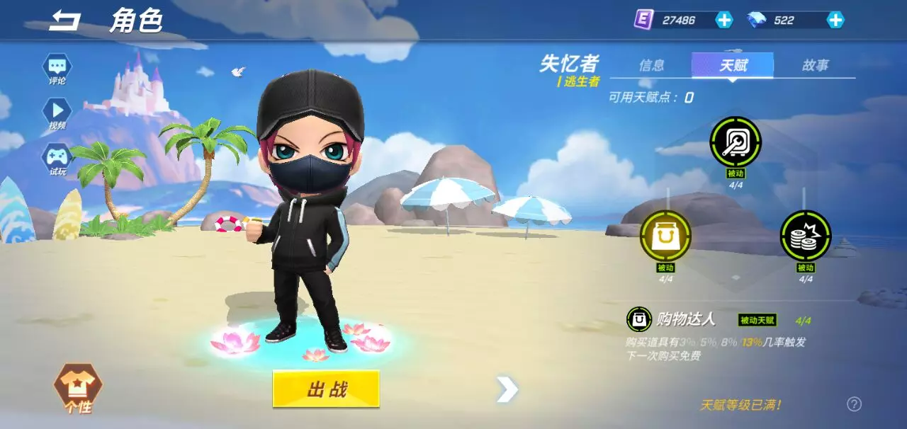 被动技:购物达人,每购买一次道具卡就有几率触发,下一次购物免费(建议大家优先购买武器),这个技能满级后触发的几率并不高,只有百分之十三,所以尽量在机关大师满级后选择升级。