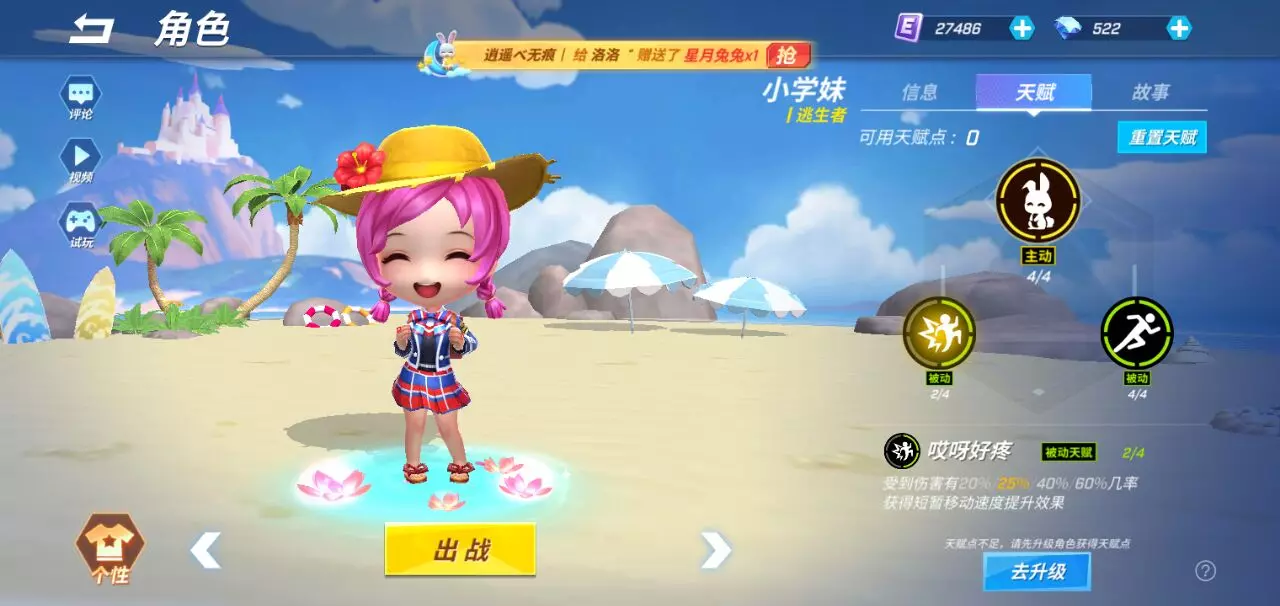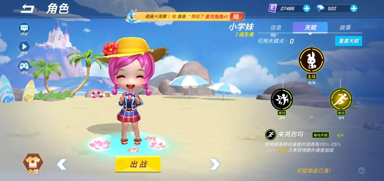 在角色方面游侠建议大家玩小学妹,因为这个角色速度可以叠加,而且主动技能可以免除控制,并且增加跳高效果,对付一些黄金局的追捕还是非常恶心的。